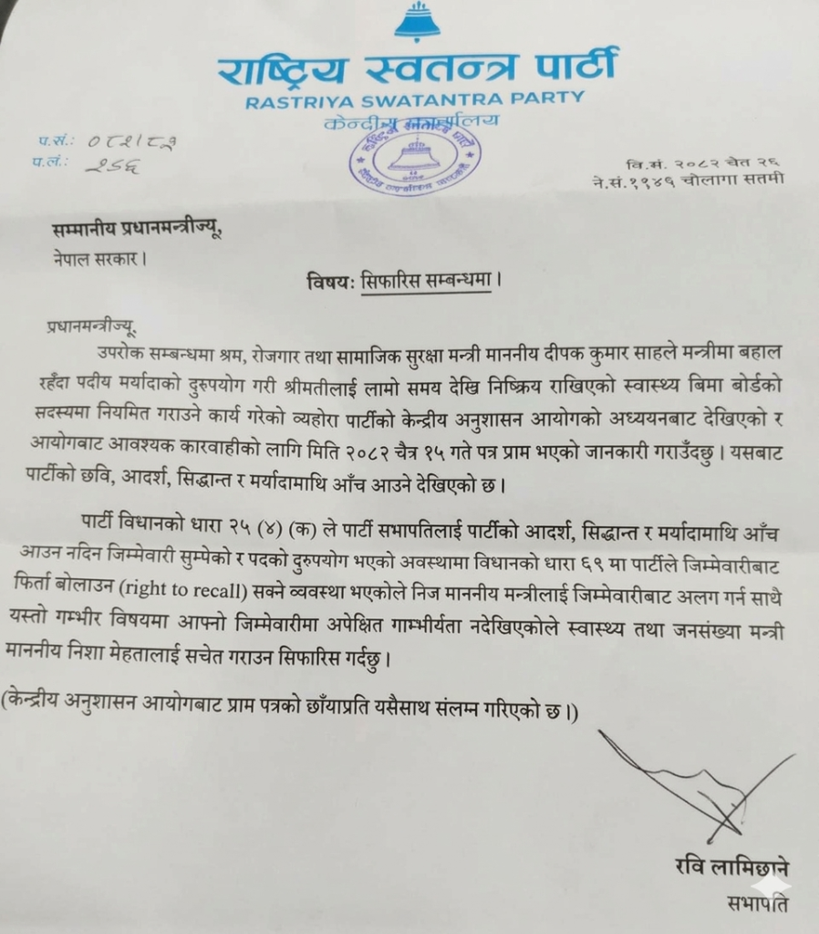यसैगरी, यस्तो गम्भीर विषयमा आफ्नो जिम्मेवारी निर्वाह गर्दा अपेक्षित गम्भीरता नदेखाएको भन्दै रास्वपा सभापति लामिछानेले स्वास्थ्य तथा जनसंख्यामन्त्री निशा मेहता लाई समेत सचेत गराउन प्रधानमन्त्री शाहसमक्ष सिफारिस गरेका छन् । सोही सिफारिसका आधारमा प्रधानमन्त्री शाहले मन्त्री मेहतालाई समेत सचेत गराइसकेका छन् ।